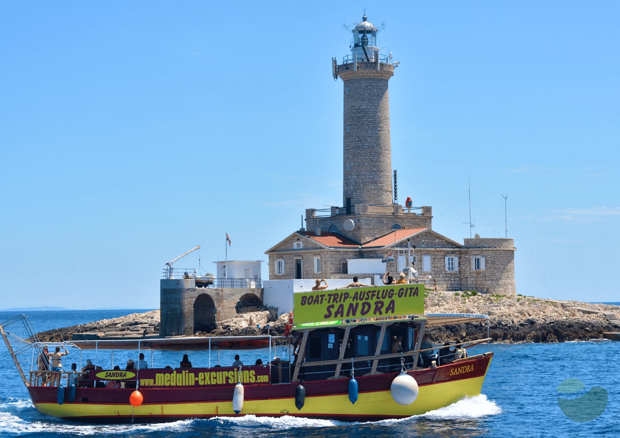 The boat-trip starts in Medulin harbour. After boarding, you will receive a welcome drink. The trip begins with a panoramic view of Medulin's archipelago. After circa 50 minutes ride the boat arrives to the southern most point of Istria - park of Nature Kamenjak, where cliffs and underwater caves can be found. It’s possible to swim with our guide inside the cave (30 minutes). The ride continues around “Porer”, the former austro-hungarian lighthouse, built in 1846. Afterwards we make a stop for a meal which is served on the boat : you can choose fish, meat or vegetarian Drinks ( wine, soft drinks and water ) are included in the price during the entire ride. Last but not least, we cruise towards the private island « Ceja » on which you will have a two or three hours stop for sunbathing, swimming, snorkeling and where you can find a local restaurant-bar. Our boat trip will slowly end, by heading back to Medulin.